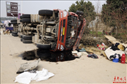 Hunan road lawenforcement vehicle pursue overload car caused the car turn and man is died(湖南路政执法车追堵超载车致其车翻人亡)