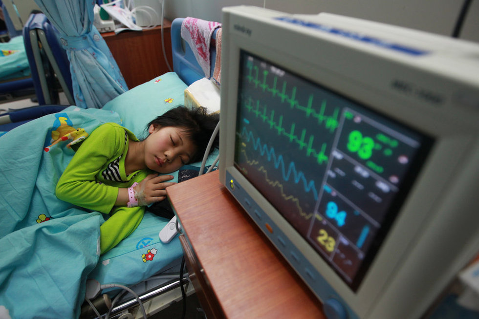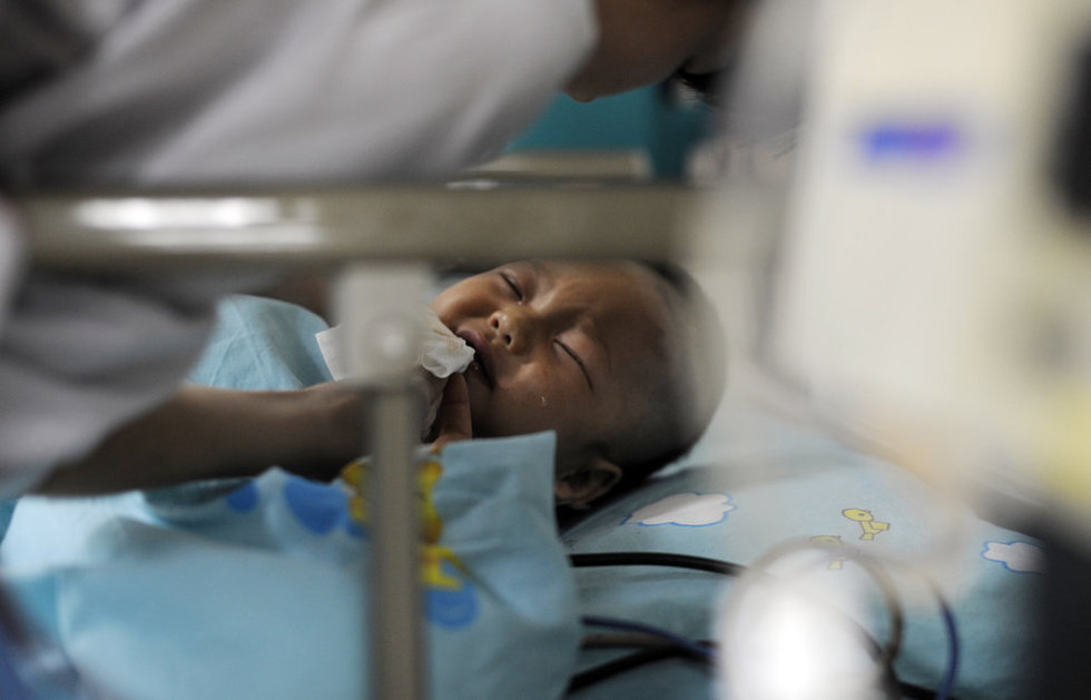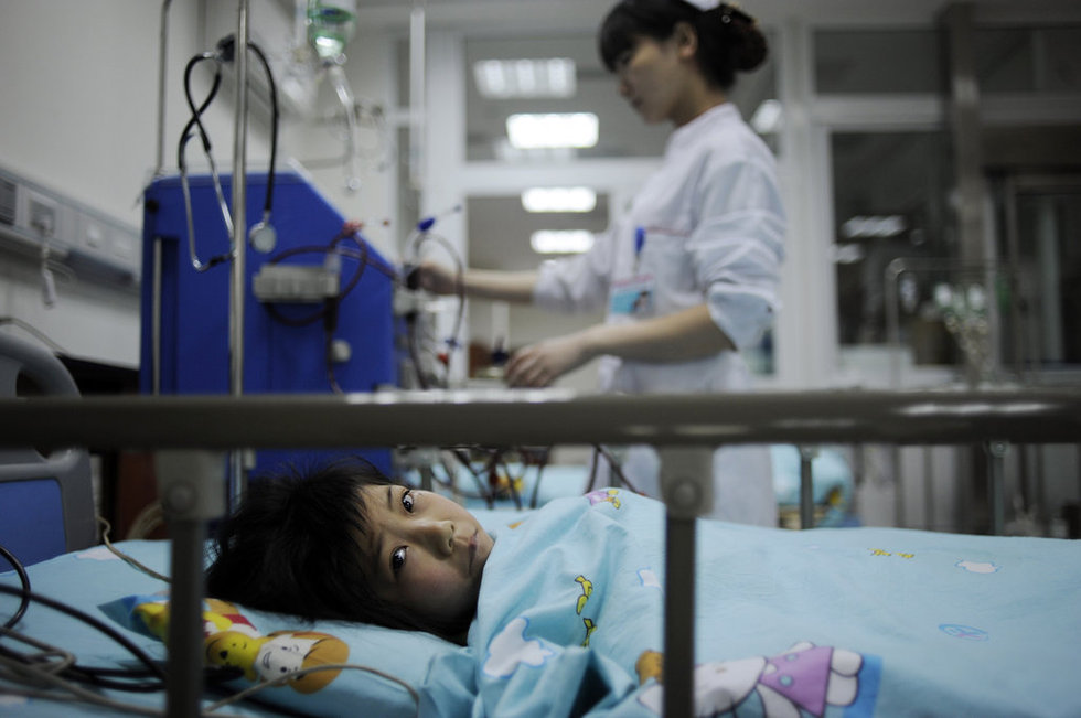 (然而此时,一家五口除了他,全都躺在病床上,生死未卜。图为3月29日,重医附属儿童医院,在接受血