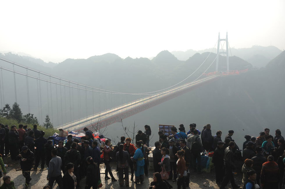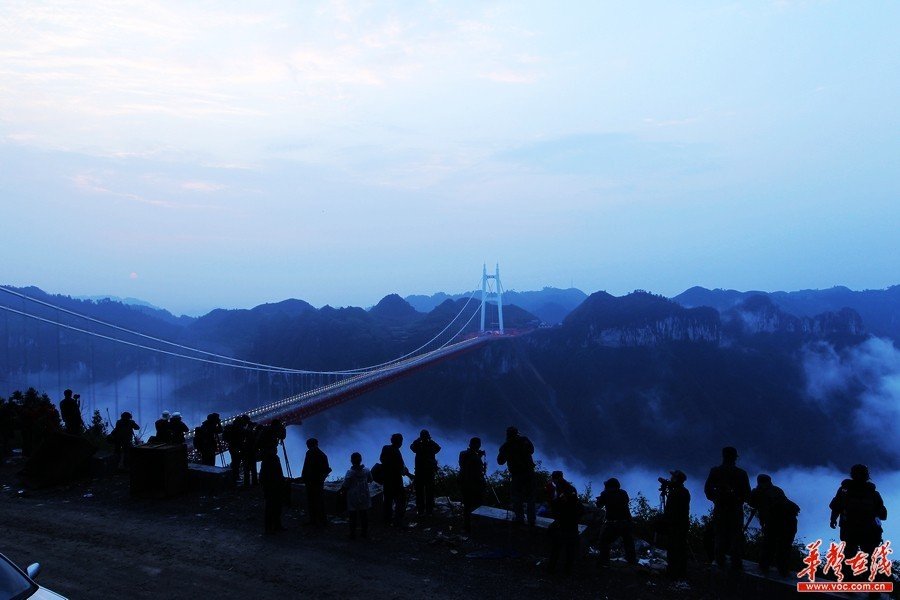 March 31, 2012, the world largest canyon span suspension bridge-xiangxi aizhai super-large suspension bridge was opened to traffic today, day just dawn, a group of citizens and photography fans have come to watch the grand occasion.