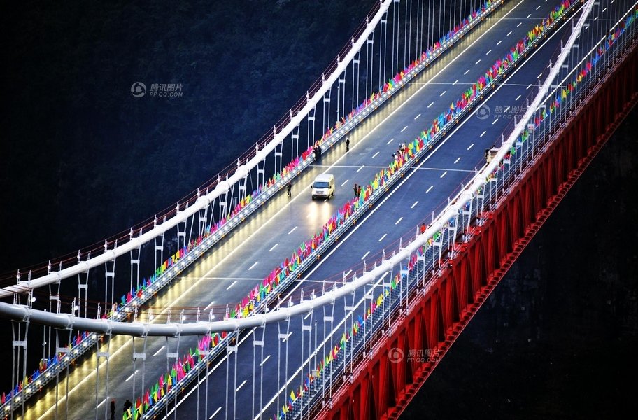 Aizhai bridge across the aizhai grand canyon, bridge deck distance is 355 meters highest canyon bottom, equivalent to 100 multi-layer building and bridge between 1176 m for a main tower, the world's largest span across the canyon steel truss girders of suspension bridge. The other three world records are: the first adopted tower, beam completely detached structure design scheme; First adopted "rail cable sliding method" erect steel truss girders; First adopted rock anchor sling structure, prestressed steel and carbon fiber as material.