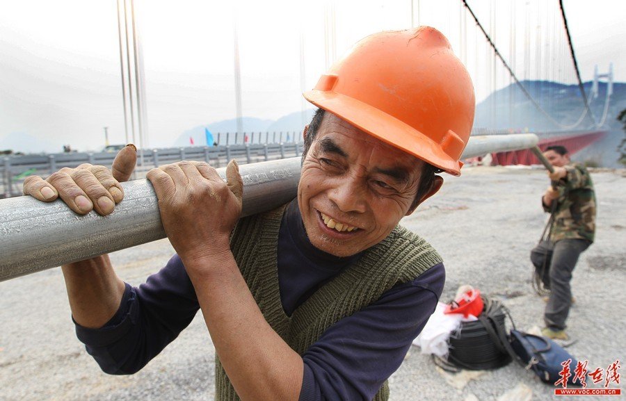 March 27, 2012, construction workers are aizhai bridge cables installed.