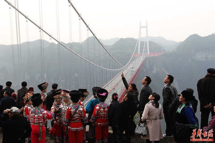 March 31, 2012, the world largest canyon span suspension bridge-xiangxi aizhai super-large suspension bridge was opened to traffic today, day just dawn, a group of citizens and photography fans have come to watch the grand occasion.