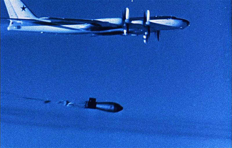 (这种巨型氢弹的设计师们经过反复考虑选定了它的运载工具——“图-95”,这是当时苏联最大型的战略轰炸机。但是即使是图-95的弹舱也无法容纳这颗超级氢弹,最终巨弹被外挂在飞机舱外,在它下面的飞机跑道上抢挖一条土沟,图-95才得以挂弹起飞)