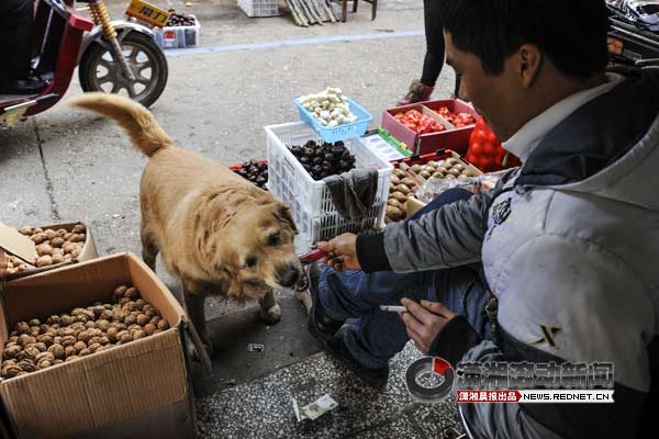 在长沙火星农贸市场附近看到一条聪明的狗狗叼着一块钱,把钱给了炒货店老板,老板递给它一跟火腿肠