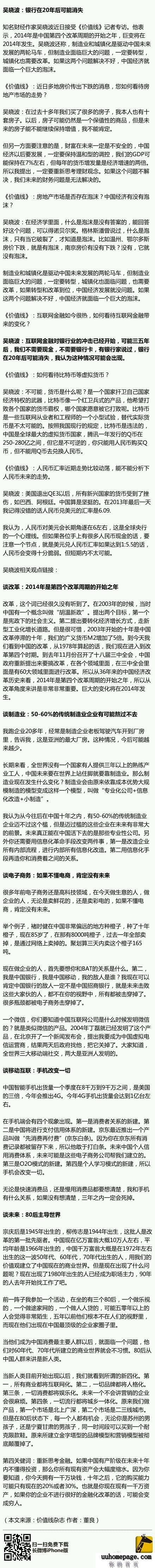 【吴晓波:银行在20年后可能消失】知名财经作家吴晓波近日表示,房子可能仍然是一个保值性的商品。我本人也有十套房子。互联网金融对银行业的冲击已经开始,可能三五年后,我们不需要现金,不需要银行卡,有银行家说过,银行在20年后可能消失,我认为这种情况可能会出现。